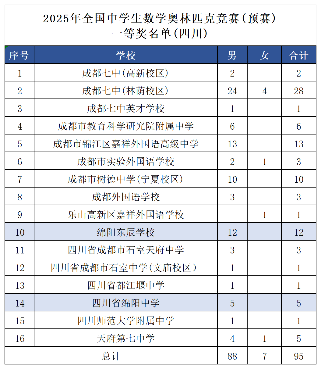 在2025年全国中学生数学奥林匹克竞赛(预赛)中四川共计95人获一等奖,其中男生88人、女生7人。