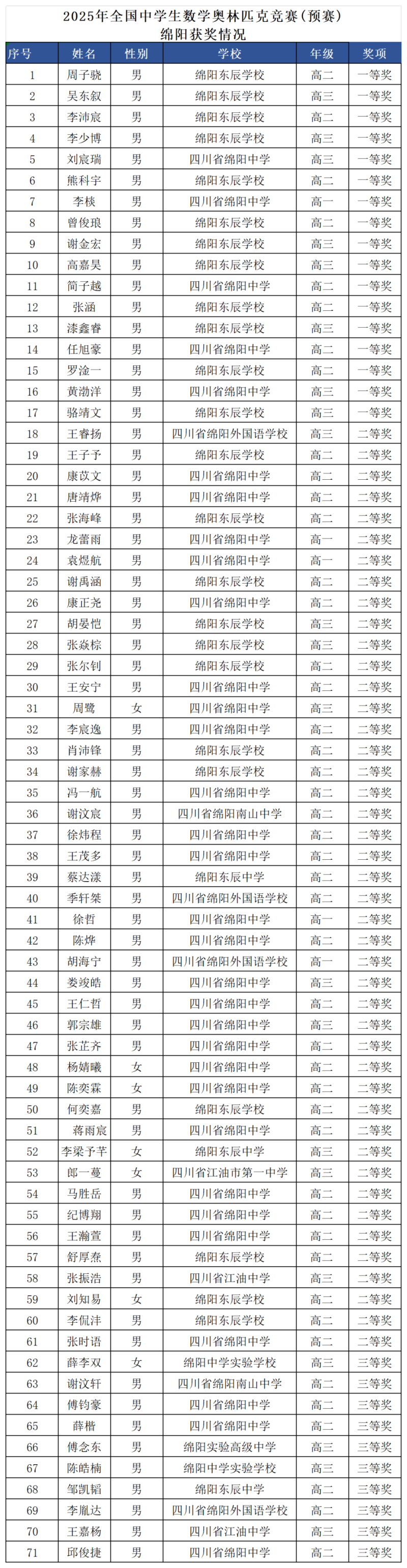绵阳共有71人获奖,分别为一等奖17人,二等奖44人,三等奖10人。